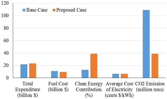 Abbas et al. (2018) [29] used genetic algorithms to optimize the generation capacities of renewable energy systems integrated with storage systems. This study evaluated the economic feasibility of the introduction of energy storage systems to the electric grid. The artificial neural network was used to validate the predicted load model. The uncertainties related to the renewable energy systems were dealt with using a chance-constrained model. Then, the problem was solved by genetic algorithms. The robustness of the proposed model was verified by its application to a case in western China. Figure 4 reports the results of the proposed method in comparison with the base case in terms of total expenditure (billion $), fuel cost (billion $), clean energy contribution (%), the average cost of electricity (cents $/kWh), and CO2 emissions (million Tons). Based on Figure 4, the use of clean energy nearly doubled, which led to a reduction in CO2 emissions from about 109 million tons to 38 million tons. Therefore the proposed case has an effective role compared with the base case.