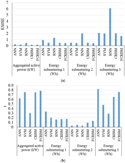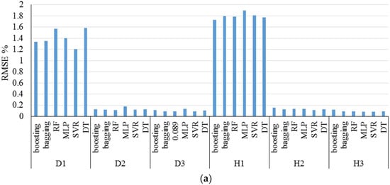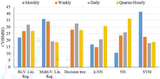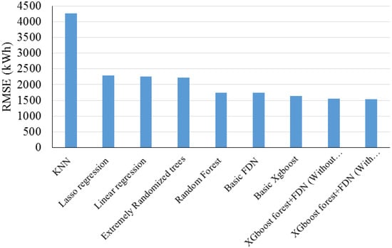 Gallagher et al. (2018) [33] studied the suitability of machine learning for the optimization of uncertainty in energy savings measurement and verification. In this paper, the new use of machine learning algorithms for energy savings in industrial buildings was studied. The applied machine learning techniques consisted of k-nearest neighbors, support vector machines, artificial neural networks, decision trees, and bi-variable and multi-variable ordinary least squares regression. The model’s prediction performances were validated to optimize model parameters. The results demonstrated that models based on ML algorithms were more precise than conventional methods. Results of RMSE have been presented in Figure 5.