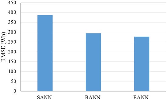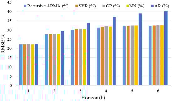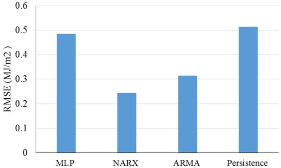 Ahmed et al. (2015) [37] performed a study on forecasting hourly solar irradiation for New Zealand. In this paper, the ability to provide 24-h-ahead hourly global solar irradiation forecasts was assessed utilizing several methods, especially incorporating autoregressive recurrent neural networks. Hourly time series were used for training and testing the forecasting methods. MLP, NARX, ARMA, and persistence methods were compared using RMSE. Figure 6 presents the related results. Based on the results, the NARX method with the lowest value of RMSE presented a precision about 49%, 22%, and 52% higher than that of the MLP, ARMA, and Persistence methods, respectively.