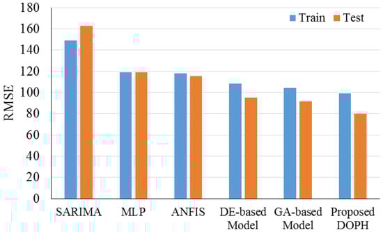 Chahkoutahi et al. (2017) [38] introduced a seasonal optimal hybrid model to forecast the electricity load. In this study, a direct optimum parallel hybrid model was presented using multi-layer perceptron neural network, Seasonal Autoregressive Integrated Moving Average, and Adaptive Network-based Fuzzy Inference System to forecast the electricity load. The main reason for using this model was to utilize these models’ advantages for modeling complex systems. The validation of the presented model implies that it was more accurate than its components. Figure 7 presents the results of the proposed DOPH method against SARIMA, MLP, ANFIS, DE-based, and GA-based models. The output of each method was compared with target values using RMSE. Based on the results, the proposed method could improve the prediction capability by 51.4%, 33.18%, 31.10%, 16.44%, and 12.8%, compared with the SARIMA, MLP, ANFIS, DE-based, and GA-based models, respectively, in the test stage.