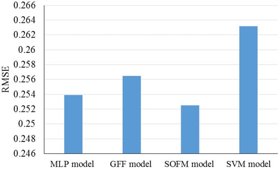 Kazem et al. (2013) [39] designed and installed a photovoltaic system for electricity production. The output of the system was measured for one year. The photovoltaic system output was simulated and predicted by self-organizing feature maps, feed-forward networks, support vector machines, and multi-layer perceptron. Ambient temperature and solar radiation data were these model’s inputs, and the PV array current and current were the outputs. The outputs of each model were compared with the target values using RMSE factor. The results have been presented in Figure 8. Based on the results, the SOFM generates the lowest RMSE value compared to the MLP model, GFF model, and SVM model. Therefore the SOFM model is suitable for this purpose.
