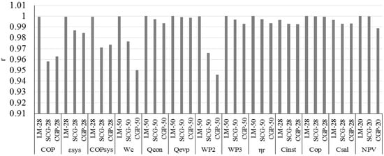 Arat and Arslan (2017) [42] presented an optimum design for a geothermal heat pump for a district heating system. Three different back propagation learning algorithms was used. These algorithms were Pola–Ribiere Conjugate Gradient, Levenberg-Marquardt, and Scaled Conjugate Gradient. The presented ELM model was composed of two stages. The second stage of the ELM structure was composed of three levels of ANN models in this proposed model. The results of this study showed that the values obtained from ANN were very close to the analytical data. Figure 9 demonstrates the correlation coefficient values, and Table 5 presents the RMSE values for each parameter separately.
