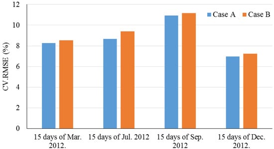 Bagnasco et al. (2015) presented a study of power consumption forecasting (load forecasting model) in hospitals. The presented artificial neural network utilizing a backpropagation training algorithm can take loads, time of the day, data concerning the type of day (e.g., weekday/holiday) and weather data. The proposed forecast algorithm can be easily integrated into the Building Management Systems real-time monitoring system. Case A includes no weather data, and Case B includes day-ahead temperature data. RMSE values have been presented in Figure 10.