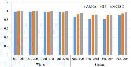 Li et al. (2018) [44] presented a multi-clustered echo state network model to directly forecast PV electricity generation. Measured and estimated PV electricity generation data characteristic such as stationarity (or non-stationarity), seasonality and complexity analysis were investigated through data mining approaches. The simulation results showed that the presented multi-clustered echo state network model can accurately forecast photovoltaic power output one hour ahead. The one-day forecast has 91–98% correlation coefficient for cloudy days and 99% for sunny days. Figure 11 presents the correlation coefficient values for the study based on day and method.