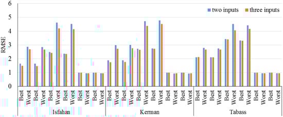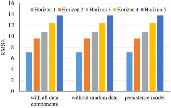 Doucoure et al. (2016) [53] developed a prediction methodology for renewable energy sources to promote the use of renewable energy isolated and grid-connected power systems. The presented method was based on artificial neural networks and wavelet decomposition. The predictability of every component of the input data utilizing the Hurst coefficient was analyzed in this study. To ensure the predictability of the information, some components with low predictability potential were eliminated to reduce the computational algorithm complexity. Figure 13 presents the RMSE values for the study in three terms, with all data components, without random data and persistence data related to the proposed method.
