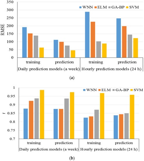 Gu et al. (2018) [54] studied heat load prediction utilizing different prediction models such as extreme learning machine, wavelet neural network, support vector machine, back propagation neural network optimized using a genetic algorithm, and wavelet neural network. Historical loads and indoor temperature were assumed to be influential. The support vector machine demonstrated smaller errors compared to the three other neural network algorithms. Figure 14 presents the values of RMSE and correlation coefficient for the study.