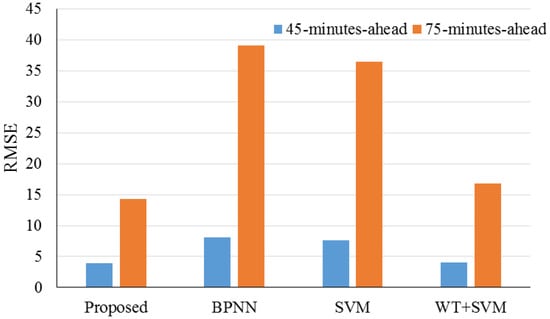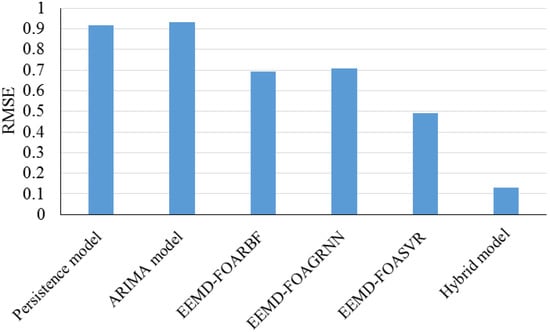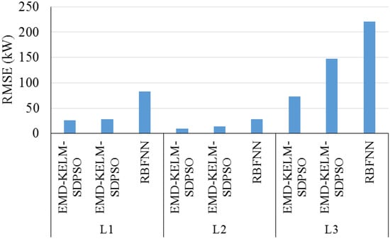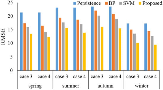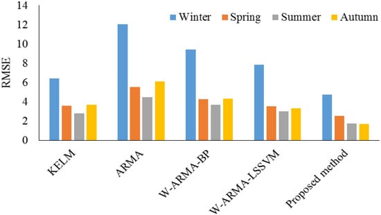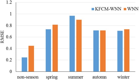 He et al. (2018) [55] proposed a hybrid forecasting model which was composed of three modules: data clustering, data preprocessing and forecasting modules. The decomposing technique was used to decrease the noise influence within the raw data series to achieve a more stable sequence to extract traits from the original data. A similar fluctuation pattern was selected for the training database in the forecasting module to improve the forecasting accuracy. The experimental data demonstrate that the presented model outperforms other discussed forecasting models in the paper. Figure 15 presents the RMSE values in cases of non-season and season datasets.