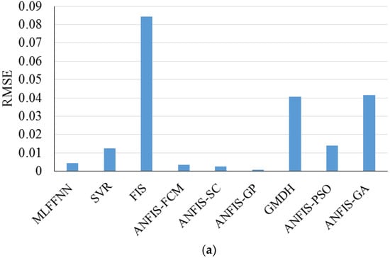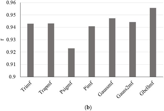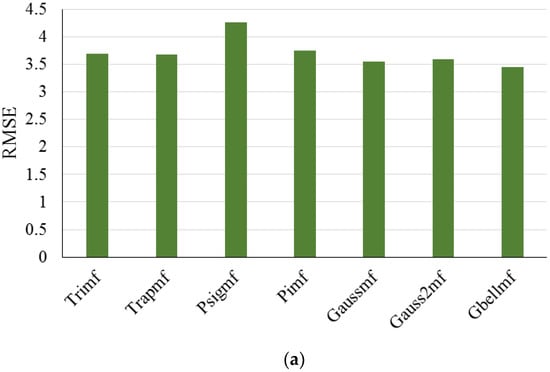 Bassam et al. (2017) [59] developed an adaptive neuro-fuzzy inference to estimate the temperature of photovoltaic systems. Experimental measurements for the learning process were comprised of six environmental variables, namely wind velocity, temperature, wind direction, irradiance, atmospheric pressure, and relative humidity and PV power output as an operational variable, which were used for training parameters. The model was validated with experimental data from a photovoltaic system with a high value for fitness correlation parameter. The results of the model show that the presented methodology was a reliable tool for modules’ temperature estimation using environmental variables. Figure 16 presents the RMSE (a) and correlation coefficient (b) values for the study. This comparison is in line with choosing the best type of membership function for ANFIS. As is clear from Figure 16, a Gbell membership function with a low RMSE and a high correlation coefficient value has the highest accuracy compared with the other types.