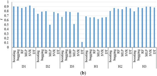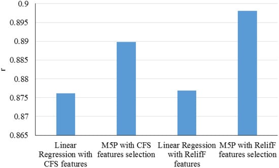 In this section the accuracy of the ML model is further evaluated. Since different ML models are available, choosing and demonstrating the superiority of the models requires comparing their performance. Hence, some comparative performance parameters are required. The most popular comparative performance parameters are the root mean square error (RMSE) and correlation coefficient (r), which are used to indicate the error and precision of the models [27,28]; Equations (1) and (2) represent these parameters.