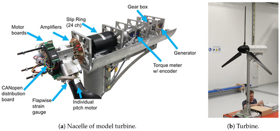 The nacelle of the turbine is shown in Figure 1a and the turbine with a size reference in Figure 1b. The rotor blades are made from carbon fiber with individual pitch motors at the blade root. The flap-wise blade root bending moments are obtained by full Wheatstone bridge strain gauges. Signals are transferred by a slip ring from the rotating to the stationary nacelle system. The rotational speed and azimuthal position are obtained by encoders. The rotor torque is measured by a torque sensor and the tower foot bending moment in fore-aft direction is recorded by strain gauges. These moments are corrected for the tower and nacelle drag by measurements without rotor blades. From these corrected moments, the rotor thrust is derived. In addition, the torque is corrected for drivetrain losses in the bearings and the slip ring. The control and data acquisition is handled with a CompactRIO PAC system and programmed in LabVIEW.