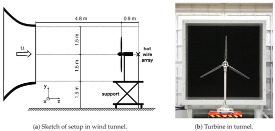 The rotor plane is located 4.8 m, i.e., 2.7 rotor diameter (D), behind the tunnel outlet. The nacelle is placed centered in the x–y plane (see coordinate system in Figure 2a) to the tunnel outlet as shown in Figure 2b. In the near wake, at a distance of 0.9 m behind the rotor plane (i.e., 0.5 D) hot wire measurements have been performed at hub height at eight different lateral positions from 0 R to 1.4 R in steps of 0.2 R. The signals of hot wires, strain gauges at blade root and tower bottom as well as rotor torque are recorded synchronously at a sampling frequency of 5 kHz.