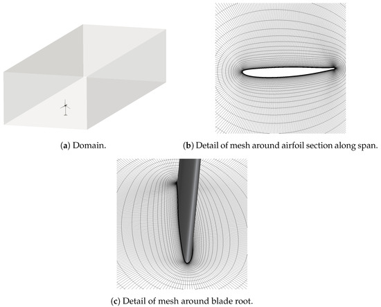The computational domain is a cuboid of 36 m length, 12.6 m width and 7.75 m height (20 D × 7 D × 4.3 D). The turbine is placed at the same 4.8 m from the inlet, however, it is positioned on the bottom face of the domain in such a way that there is no flow under the turbine. A series of mesh refinements were performed towards the turbine and in particular towards the blades. The idea was to refine the blades in order to better resolve the aerodynamic effects on these, therefore obtaining better results for the integral quantities as well as the wake and downwind velocities. The meshing for the blades was performed using the in-house tool “bladeBlockMesher” [22] while the rest of the turbine was meshed with the in-house “windTurbineMesher” tool [23]. Some of the details of the mesh generation can be observed in Figure 3. The resulting mesh consisted of approximately 32 million cells achieving a value of 1.