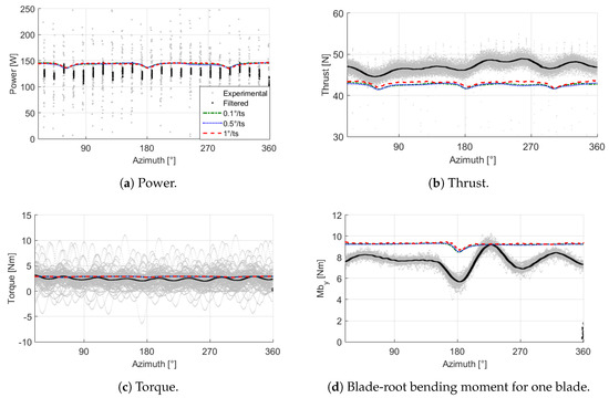 There are several observations that can be made from Figure 4. First of all, it is clear that the model is able to recreate to a good extent the measurements. In particular, the tower shadow effect is clearly presented in each one of the graphs shown. This can be seen as the sudden decrease in the integral quantities, when one of the blades is aligned with the tower (i.e., , and azimuth). In particular, Figure 4c shows that the experimental measurement for the torque is highly oscillating, due to the torque controller that the MoWiTO turbine uses. This is why in Figure 4a, the data for power is presented only at some specific azimuthal positions (every ).