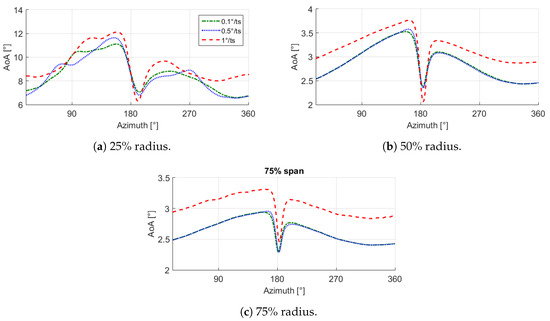 Angle of attack for one blade, at three different points along the blade span. The angle of attack was determined using Rahimi’s three point method [24,25].
