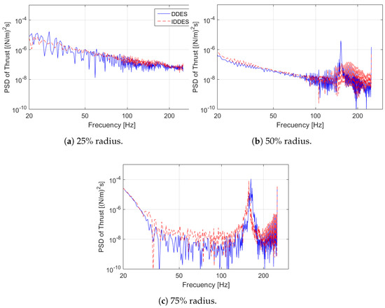 Power Spectral Density for the thrust normalized by blade radius, for 25%, 50% and 75% blade radius.