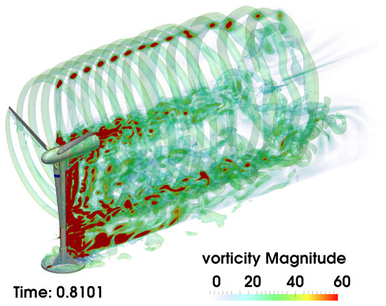 In general, all simulations proved to model the phenomena correctly. All simulations were able to reproduce the tower shadow effect, demonstrating that the dynamic mesh model was correctly implemented. On the other hand, the PSD graphs and the vorticity visualization help to validate the correct use of the boundary conditions, in particular by being able to recreate the vortical structures near the rotor’s axis and the tip vortices. It could also be stated that an IDDES turbulent implementation using of rotation per time step, with a mesh of 32 million cells, is able to achieve good results without incurring higher computational costs. Furthermore, the evolution of the angle of attack as a function of the azimuthal position (Figure 5), validates once again the accuracy of the 3-point method developed by Rahimi et al. [24].