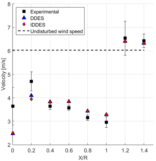Once again, a good agreement between the numerical and experimental results is achieved. With the exception of the measurements at 0 and 0.2 radii, both turbulent implementations present a very similar behavior. This is expected, taking into account that for the two probes closest to the hub and nacelle there are high turbulent fluctuations present. This has been shown in experiments such as the ones performed by Akay et al. [27] where the intricacies of root flow are confirmed. In order to evaluate quantitatively how the computational results differ from the experimental ones, Figure 9 and Table 4 show the average velocity for each probe in the wake.