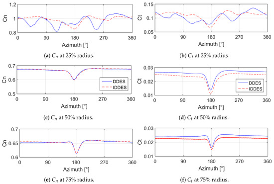 It was decided also to look at the behavior of the tangential and normal forces at different sections along the blade radius. This was intended to compare the aerodynamic behavior of both implementations. In Figure 10 the results for the normal () and tangential () force coefficients can be observed, at three different sections along the blade radius.