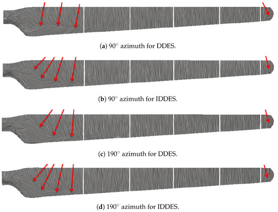 In a similar way, Figure 11 demonstrates there is no great discrepancy in the wall shear stress for the DDES and IDDES turbulent model. This figure shows the wall shear stress at the suction side, for two different azimuthal angles, for both DDES and IDDES turbulent models. These images validate that the flow is only separated at the root, and barely at the tip of the blade. The main difference in this case, is that the flow separation for the DDES model happens approximately at the 40% span, while for the IDDES model it occurs closer to the 30% section. Looking towards the tip of the blade, at the trailing edge, it is clear that there is some separation which leads to the formation of the tip vortices. In this case, it can be seen that for the IDDES model, this separation is more evident. This is where the major advantage of using IDDES can be observed. Should the turbine be set at a more critical condition (i.e., larger pitch angles), the effect of separation should be even more noticeable. This is taking into account that the separation phenomenon in the IDDES simulation is occurring closer to the root, and more defined towards the tip. Thus suggesting that this separation is a better representation of the physical phenomenon, instead of the DDES which has some numerical effects that lead to separation further along the blade’s span.
