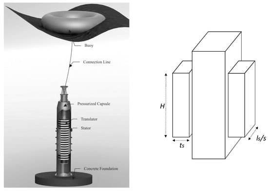 Left: Sketch of the wave energy converter concept from [] licenced under CC BY 3.0 https://creativecommons.org/licenses/by/3.0. Right: Sketch of linear generator geometry. The figure shows two out of four sides of the generator stator and the geometrical parameters of the stator. The translator is in the middle and moves up and down. H denotes stator height, the total stator length, the stator thickness and s the number of stator sides.