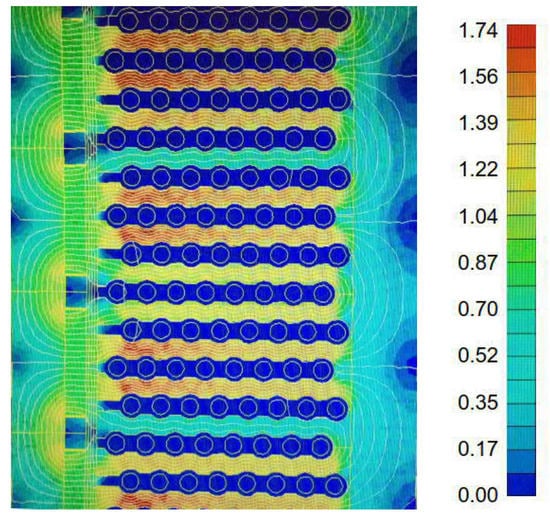 A simulation tool based on field equations coupled with circuit equations and solved with FEM has also been used for verification. The simulation method is further explained and has been experimentally verified for a rotating generator in []. A FEM simulation was performed for the original generator design. All geometrical parameters from Table 1 was inserted in the FEM program. The end winding length was adjusted to reach the inner resistance of 0.64 . The generator was run at rated speed and rated current density when connected to a resistive load. The rated voltage and power was achieved for the given generator dimensions. However, a slightly higher magnetic flux density amplitude in the airgap of 0.92 T was needed to achieve the rated voltage. In the MATLAB calculations the magnetic flux density was 0.75 T. Some simplifications in the MATLAB model are that the winding factor is set to 1, the stacking factor is set to 1, and that no saturation is taken account for. If the winding factor of 0.91 (for a q of 5/4) and a stacking factor of 0.96, is taken into account, the magnetic flux density in the calculations corresponds to 0.86 T, which is still slightly lower than the FEM simulations. This is a reasonable result as no leakage flux is included in the MATLAB simulations. To compensate for this, a higher magnetic flux density can be achieved by adding more PM material. The FEM simulations verified that no parts in the generator were saturated as the maximum magnetic flux density was 1.74 T and occurred in the stator teeth. Therefore, the MATLAB simulations have been verified against FEM simulations and gives acceptable results at least for a starting point for design work. However, FEM simulations are needed to account for all effects when designing a generator. The geometry and the magnetic flux density for the original generator from FEM simulations can be seen in Figure 3.