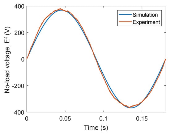 To verify the simulation method, the induced voltage at no load has been compared to measurements. The experiment was performed on a multi-pole, low speed rotating generator designed for a wind turbine and presented in []. The tested generator is similar to the tested linear generators studied here as it has a large diameter (so for one pole pitch it is close to linear), a low speed in the airgap and a relatively large number of conductors per slot, , of six. No changes in the simulations were needed to simulate the no-load voltage for a rotating generator instead of a linear generator. The magnetic flux density in the airgap was measured on the prototype and fitted very well with FEM simulations with an amplitude of the fundamental of 0.93 T []. The experimental generator is rated at 225 kW at 33 rpm corresponding to an electrical frequency of 9.9 Hz and an airgap speed of 3.5 m/s. It has a stator length of 0.884 m, a diameter of 2.054 m, 3.75 turns per pole and phase and 36 poles consisting of surface-mounted NdFeB-magnets. The stacking factor was measured in the prototype to 0.954 and the winding factor is calculated to 0.915. In the experiment, the rotational speed of the generator was lower than the rated speed. It was run with an electrical frequency of 5.5 Hz corresponding to a speed in the airgap of 2.0 m/s, which is closer to the operating frequency and speed of the linear generator. An oscilloscope (Tektronix TDS2014) and a high voltage probe (Tektronix P5120) were used to measure the voltage. The simulation was run with the properties of the experimental generator and gives a result as the rms value of the voltage at the given speed. The voltage has then been plotted as a sinusoidal signal with the simulated frequency.