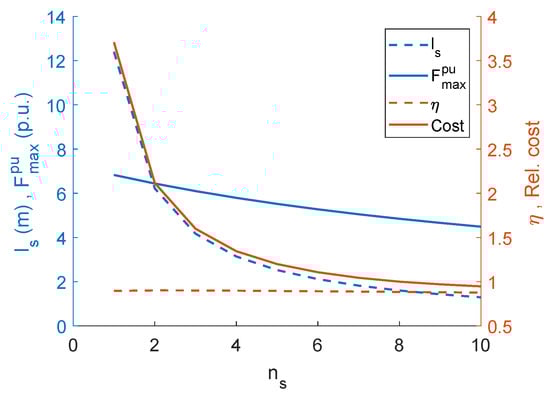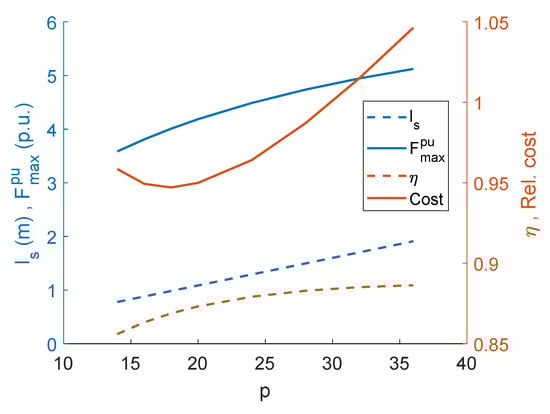 Figure 5 shows the effect of varying and simultaneously to achieve the same output power of 18.4 kW. It can be seen that the cost and required total stator length, is decreased with increasing number of cables per slot. However, the maximum damping force is also decreasing with increasing number of cables per slot. The efficiency appears constant but is actually slowly decreasing with increasing number of cables. It is shown that only using one cable per slot is probably unrealistic both from a space and cost perspective.