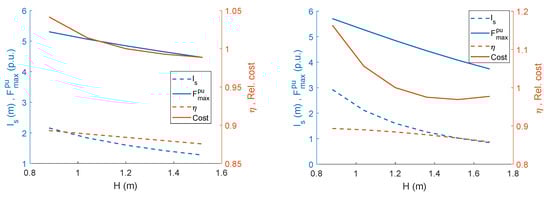 Stator length, maximum damping force in per unit, efficiency and relative cost for the original generator design with varied stator height, H and an adjusted stator length, to achieve an output power of 18.4 kW. Left figure: The pole pitch is fixed. Right figure: The number of poles is fixed, so the pole pitch varies.