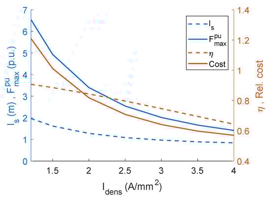 Generator cost is difficult to estimate as it depends on many different variables. Here, a simplified approach is used to calculate a relative cost for comparing different designs. The translator height is here assumed to vary with changing stator height, with the free stroke length kept constant at 1.998 m. Therefore, the variation of translator cost will both be dependent on and on (). The number of poles and number of conductors per slot will also slightly alter the magnet weight needed, but that effect is omitted here. For a design with ferrite magnets the magnet cost and weight is not so crucial, whereas it has a large impact on expensive magnets made of NdFeB. The translator body in a generator with low electrical frequency can be made of solid steel. The total generator cost is presented as a relative cost, normalized against the original design, see Section 5.1. Here, a conductor (copper) cost per kg three times higher than the cost per kg for stator steel is used as well as a translator cost of half of the stator cost for the original design. The density of copper is 8960 kg/m and the density of stator steel is 7600 kg/m. The relative cost is then calculated as