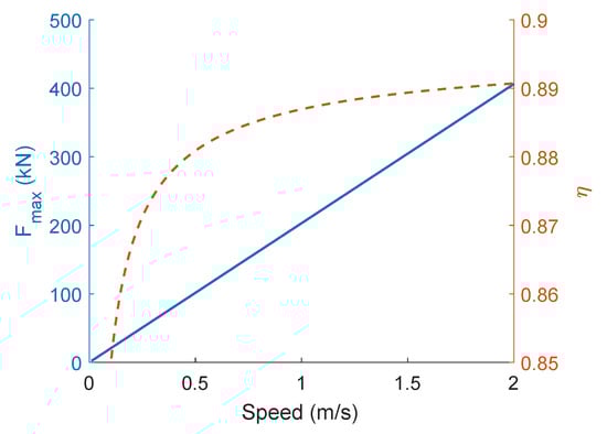 Maximum damping force and efficiency for different speeds for the original generator design operated with CTA control. The efficiency is here shown for a generator run with the damping force increasing linearly with increasing speed.