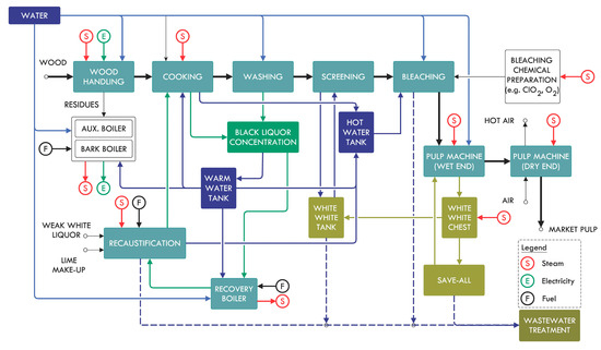 Typical research in water–energy optimization in the pulp and paper industry is often limited to specific sections of a plant and lack a global vision of the process (e.g., brown stock washing system [28], white water networks [29], bleaching stage [30], and evaporators condensates and vacuum pump sealing reutilizations [31]). This results in the absence of a systematic approach that can address all interconnections among heat, water, and power in the pulp and paper industry. This paper proposes a methodology to address all these elements in a systematic manner through its application on a bleached kraft pulp mill case study.