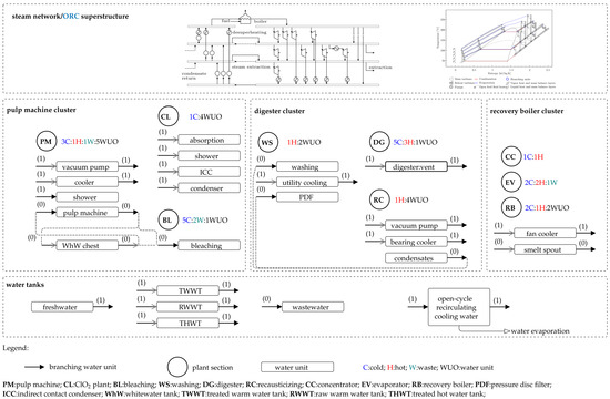 Figure 3 illustrates the overall layout of the kraft mill together with the considered clustering. All water unit operations are also shown in this figure. The units with filled arrows follow the branching approach [17] where a splitter/mixer is placed at their outlets/inlets, respectively.