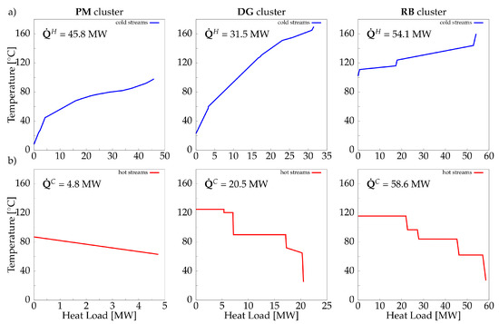 Cold (a) and hot (b) grand composite curves of considered clusters for kraft case study, reflecting current consumption.