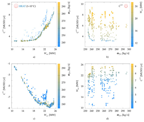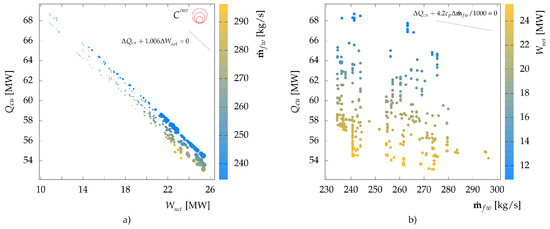 Overall results of the optimization are shown in Figure 6. Freshwater consumption of the optimal solutions ranged between 230–295 kg/s, (less than 35% of the current consumption), while net power output increased from 3.2 MW in the current conditions to 10–25.4 MW. The main reasons of the large increase in the electricity production can be attributed to many factors: