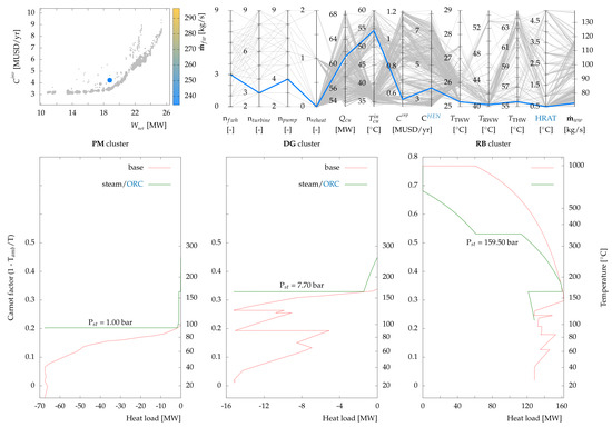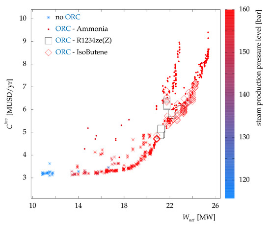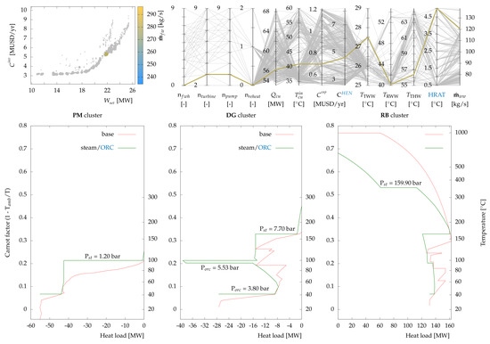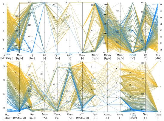 Table 4 presents the set of decision variables for the current case study. It comprises the steam cycle decision variables (pressures and level of superheating at the highest pressure level), ORC (pressures, levels of superheating, reheating, and the working fluid), and water network (tank temperatures and HRAT of water thermal streams). Solver options used in the outer and inner optimization levels are also provided in Appendix B. Similar to the approach in [16], Dakota’s JEGA library [37,38] was used for the outer level, while the commercial solver CPLEX [39] within AMPL [40] was used for the inner MILP problems P1 and P2. Each instance of problem P1 had 1129–1359 binary variables and 7588–9053 constraints. In contrast, problem P2 consisted of 101–361 binary variables (i.e., potential thermal matches) and 1021–3012 constraints. The number of solutions in each generation of GA was fixed at 400 to reduce the number of mutations and crossovers while maintaining diversity within the Pareto frontier. In what follows, the last two generations (after 80,000 function evaluations) are combined and presented.