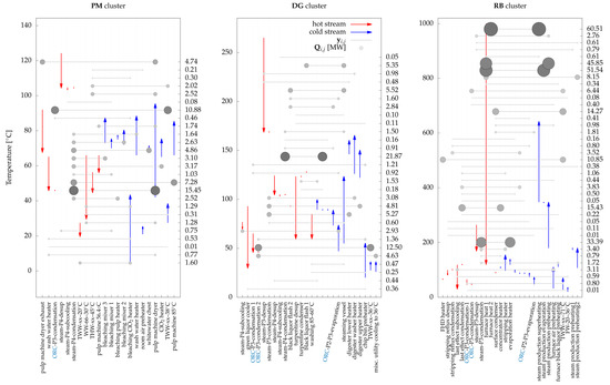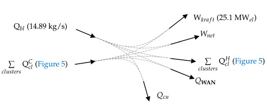 To represent the current distribution of different departments in the kraft mill and to impose certain restrictions on heat and mass exchange, the mill was divided into three “industrial clusters” (similar to the schematic representation in Figure 1):