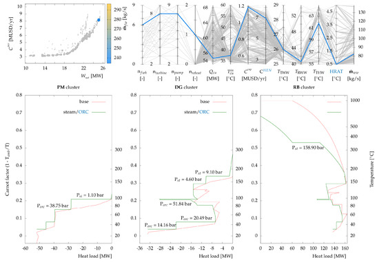 Figure 5b–d illustrate heat integration potentials within each industrial cluster. In total, 93.9 MW of hot utility and 46.3 MW of cold utility are required, exhibiting a difference of 44.2 MW compared to the total site minimum energy requirement (MER), due to cluster distribution and forbidden matches. Heat recycling among clusters can alleviate this increase in utility consumption. Notably, the pulp machine cluster requires heat at low temperatures (below 100 C), which can be partially satisfied by available medium-temperature waste heat from the other two clusters. Heat recovery between clusters can be achieved via the water network or through an ORC. An ORC can be integrated such that thermal streams in the pulp machine cluster act as a condenser while heat is transferred, and electricity is produced.