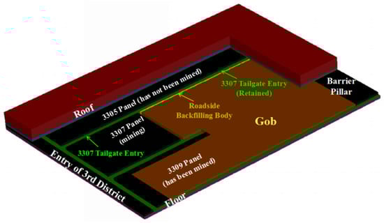 Before the extraction of the panel, the 3307 tailgate entry (3307 RGE) is first excavated along the floor, whose width is 5800 mm. And the width of the retained entry is 4800 mm. The width of the RBB is 1400 mm. Then the fully-mechanized panel is extracted. A very soft elastic material is used in the gob to approximately simulate the gangue [35,36]. At the same time, the RGE is retained.