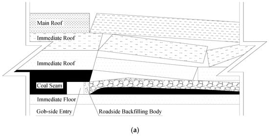 In recent years, a great deal of research into RGE for FMLP has been carried out [5,6,7,8,9,10]. Many studies have indicated that the deformation and stress distribution of roadside backfilling body (RBB) play an important role in RGE [11,12,13,14,15,16]. Ma et al. (2007) established the mechanical model of surrounding rock structure for RBB and suggested that the stability of surrounding rock in RGE is closely related to support the resistance of RBB and support method for RGE [17]. Zhang et al. (2001, 2002) studied the deformation characteristics of RGE in FMLP through physical modeling and pointed out that the RBB not only has a certain strength, but also has a certain ability to resist deformation. Using the numerical simulation, break position and shape of the main roof along the RGE, the influence of different support methods on the roof movement and the relevant technical parameters of RBB were analyzed [18,19]. Tan et al. (2015) studied the stability of RBB under hard roof condition by using flexible-hard support model for RGE [20]. Zhang et al. (2015) analyzed high-water packing materials in RGE using numerical analysis, and the optimal width of the RBB was analyzed [21].