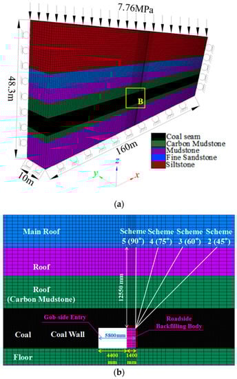 Half of 3307 panel is taken to establish FLAC3D numerical model, whose dimensions are 160 m (length) × 10 m (width) × 48.3 m (height), and the height of the roof pre-split is 12.55 m. The angle of the pre-split hole is 0° (without pre-split), 45°, 60°, 75°, 90°. Besides, the number of meshes and nodes of each scheme is shown in Table 3. The model is shown in Figure 7 [34].