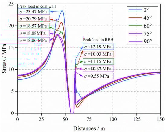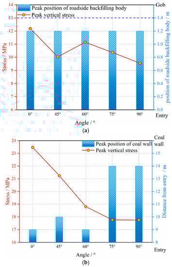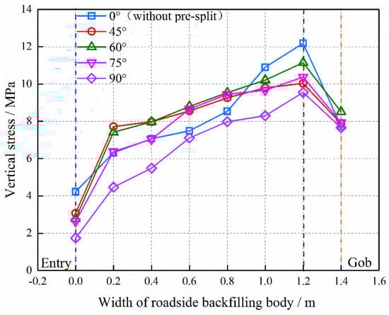 When the roof pre-split angles are different, the positions of peak load have no difference in the middle of RBB of 3307 RGE, as shown in Figure 10. With different roof pre-split angles, the vertical stress increases gradually from 0 m (at the edge of RBB near 3307 RGE, the navy blue vertical dotted line showing in Figure 10) to 1.2 m (at the RBB near 3307 gob, the brown vertical dotted line showing in Figure 10), and decreases from 1.2 m to 1.4 m (at the edge of RBB near the 3307 gob, the orange vertical dotted line showing in Figure 10). And they are all in a state of asymmetric distribution. The peak load in RBB is at 1.2 m. That is, the position of peak load in RBB does not change with different angles, but the value decreases from 12.19 MPa to 8.71 MPa, as shown in Figure 11a. That shows the bearing capacity of RBB increases significantly with the increase of the roof pre-split angles.