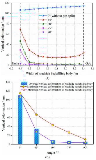 The vertical deformation of RBB is shown in Figure 12a. The vertical deformation of RBB gradually decreases and eventually becomes stable with the increase of the roof pre-split angles. The maximum vertical deformation, the minimum vertical deformation and the average vertical deformation with different angles are shown in Figure 12b. When the angle is 0°, the value of the vertical deformation (including the maximum vertical deformation, the minimum vertical deformation, and the average vertical deformation) of RBB is maximum. The average vertical deformation is up to 110.51 mm, but the value of the difference between the maximum and the minimum vertical deformation is not significant. When the angle is 45°, the average vertical deformation of RBB is 34.39 mm, which clearly decreases compared with that with the angle of 0°. That indicates the effect is more obvious to reduce the vertical deformation of RBB. The difference in the value between the maximum and the minimum vertical deformation is 38.38 mm. When the angles are 60° and 75°, respectively, the average vertical deformation is 9.86 mm and 7.52 mm. The differences between the maximum and the minimum vertical deformation are 37.47 mm and 22.43 mm, respectively. The vertical deformation is still reduced compared with the angle of 45°, including the maximum vertical deformation, the minimum vertical deformation and the average vertical deformation. When the angle is 90°, however, the average vertical deformation is 6.1 mm, which is minimal compared with other roof pre-split angles. The difference between the maximum and the minimum vertical deformation is 6.95 mm, which means the vertical deformation of RBB tends to be leveled off.