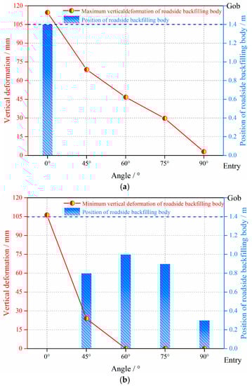 Values and positions of maximum and minimum vertical deformation of RBB with different angles: (a) values and positions of the maximum vertical deformation of RBB and (b) values and positions of the minimum vertical deformation of RBB.