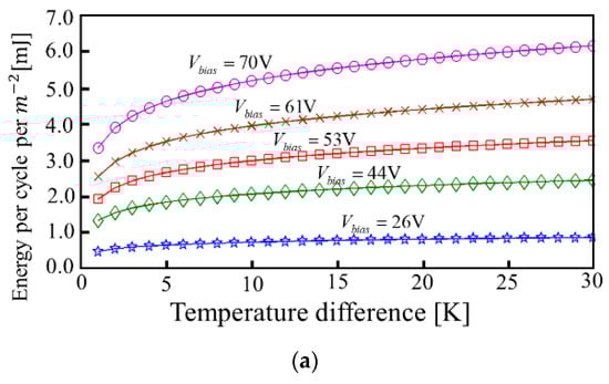 The aforementioned frequency (Figure 7, Figure 8 and Figure 9) of the Stirling engine is simulated through Equations (25) and (26). The dielectric coefficient of acrylic (εa) is 3.7, and the dielectric thickness (h) is 1 μm. The energy and power produced can be calculated. As displayed in Figure 10a,b, different bias voltages (26, 44, 53, 61, and 70 V) are produced between the two plates of the capacitor. The variable capacitance produces power along the piston of the Stirling engine. As per the computational results, the energy harvester produces 6.2 mJ of energy per cycle per unit area at a bias voltage of 70 V and temperature difference of 30 °C. Thus, the engine produced 21 mW of energy per unit area.