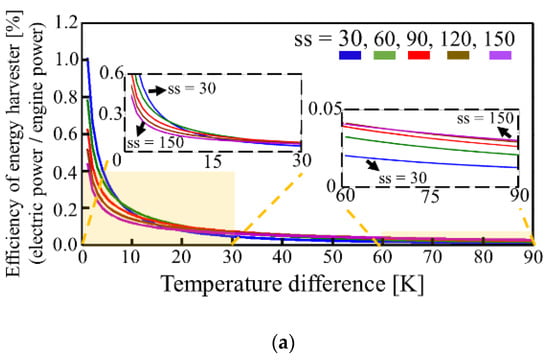The conversion efficiency of heat energy into electric power is calculated using the formula ηhe = 100(P/q). The conversion efficiency of engine power into electric power is calculated using the formula ηee = 100(P/η). In this study, η = 1 − (T4/T1), Aover = ADc, h = 1 μm, and Vbias = 70 V. A dimensional number (ss) is delineated to adjust the size of the Stirling engine. For instance, an ss value of 2 indicates that the length, mass, and gap between the displacer and displacer cylinder of the Stirling engine become two times the dielectric thickness. The efficiency of the heat engine power (η) is proportional to the temperature difference. However, the relationship between the frequency of the wheel and temperature is a concave curve. When ΔT > 10 K, the rate of increase decreases. Therefore, the conversion efficiency of engine power into electric power follows the trend of a convex curve (Figure 11a). Considering the dimensional efficiency, a large energy harvester is suitable for high temperature differences. For instance, ηhe (ss = 150) is twice ηhe (ss = 30) at ΔT = 60–90 K. In Figure 10, each curve of ηee has a maximum value [ηee,max(ss = 30) at ΔT = 7 K, ηee,max(ss = 60) at ΔT = 18 K, and ηee,max(ss = 90) at ΔT = 30 K], the corresponding temperature difference is the best temperature difference (Tbt) for the conversion efficiency of heat energy into electric power. Thus, ηee exhibits positive growth for temperature differences below Tbt.