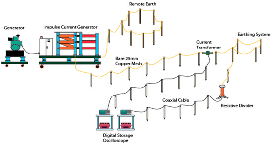 Other concerns for the field measurements and testing of the earthing systems under high impulse conditions are the placement of current transducers during the field measurements. In some published papers [23,24,25,26], the experimental arrangement was not shown at all, though some parameters of the generators and test circuit are described. Due to the different possible arrangements of the remote earth, surrounding the electrode under tests and away from the electrode under test, as highlighted in Section 3, the placement of the current transducer (CT) would expectedly be different too.