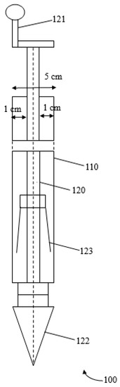In this study, two configurations were adopted: a grounding device with spike rods (configuration 1) and one with four rod electrodes (configuration 2), shown in Figure 3 and Figure 4, respectively. Configuration 2 represents a conventional electrode, where the design does not emphasize any enhancement of the ionization process. Configuration 1 was developed based on the evidence from the work by Petropolous [28] that when spikes or needles were attached to the spherical electrode, lower impulse resistance values were noted for the same voltage due to the higher field intensities at the spikes. This indicates the effectiveness of the earth electrodes with spikes as compared to electrodes without spikes. In this paper, a new grounding electrode with spike rods is introduced. By having spike rods at the electrodes, a high electric field intensity will be concentrated at the spikes, which encourages soil ionisation and breakdown processes to take place, hence allowing more current to be discharged to the ground. This will result in a more effective grounding system. For this reason, and to provide more contact between the electrodes and surrounding soil, a grounding device with spike rods (consisting of two rods (inner shaft (120) and outer shaft electrodes (110)) was adopted. The grounding device with spike rods is 1.5 m in length. The diameter of the inner rod is 3 cm, and outer rod is 5 cm, with a gap between inner and outer rods of 1 cm. There are five spikes (123), each one of 20 cm length. During the installation, the spike rods (123) are kept closed from the surface. For the installation, due to its large diameter, a pre-bore with a diameter of 4 cm was firstly performed using an auger. Upon completing a pre-bore hole with a depth of 1.5 m, the grounding device with spike rods (100) is positioned into the hole, in a generally vertical configuration, with all the spike rods (123) concealed and protected from damage within the shaft. The outer shaft (110) is subjected to impact force while it is driven through hammering into the ground. During driving, the top end is protected by a dolly or capping to protect the top end of the shaft against any damage from driving or hammering the electrodes. Once the grounding device with spike rods (100) reached the required distance, 1.5 m, the inner shaft (120) was turned using the provided winch (121) in such a way that the grounding spike rods (123) protruded out and pierced into the soil mass. An indication that all the spike rods (123) protrude out is when the winch stops, and is not able to turn the inner shaft (120) anymore. Another type of ground electrode used in this study consists of four ground rod electrodes, with each rod of 20 mm diameter, and a depth of 1.5 m. Copper mesh of 25 mm width and thickness of 2 mm was used to connect the rod electrode at all four points, as shown in Figure 4.