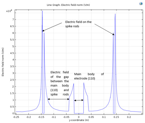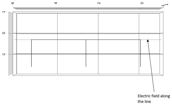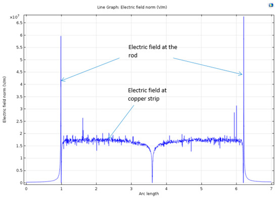 In this study, the Finite Element Method (FEM) was utilized to obtain the voltage profiles for both configurations. Figure 5 and Figure 6 show the point of electric profile is taken for configurations 1 and 2, respectively. The soil resistivity was taken at the beginning of the tests using a Wenner Method, which was computed as a two-layer medium model, using a Current Distribution, Electromagnetic Fields, Grounding and Soil Structure Analysis (CDEGS) software. It was found that the resistivity at the top layer is 119.5 Ωm with a depth of 7.18 m, and the bottom of a two-layered soil is 391 Ωm, with an infinite depth. Both configurations were injected at 5 kA. The corresponding trends of the electric field for configurations 1 and 2 are shown in Figure 7 and Figure 8, respectively. As can be noted, the shapes of the electric fields for both configurations are different when a similar soil resistivity layer was used. A higher and more non-uniform electric field was noted for configuration 1, where the maximum surface potential is 820 MV (see Figure 7). For the case of configuration 2, the potential is rather uniform, with 650 MV at the rod, and 180 MV at the copper strips (see Figure 8). The FEM simulation indicates that configuration 1 is preferred, since it can increase the electric field significantly, and has non-uniform electric field, thus reducing the earth resistance value more significantly under transient conditions, compared to configuration 2.