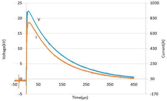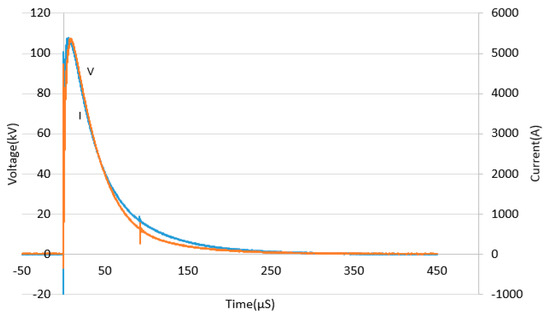 Voltage and current traces for configuration 1 at a charging voltage of 30 kV.