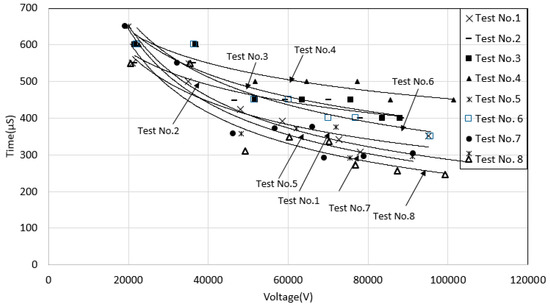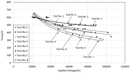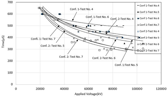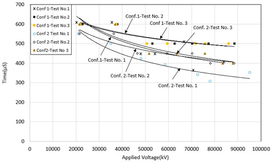 Right after RDC measurements, impulse tests were performed on both test electrode configurations on the same day. Impulse currents and the corresponding voltages were measured and shown in Figure 10 and Figure 11 for configuration 1, at charging voltage of 30 kV and 210 kV, respectively, for test no. 1. As can be seen in the figures, faster times to discharge to zero for both voltage and current traces was seen at higher voltage magnitudes. Similar voltage and current traces were seen for configuration 2, and for other test nos., where faster times to discharge to zero for both voltage and current traces at higher currents were observed. The time to discharge to zero for voltage and current was plotted against the applied voltage for all the tests, the time to discharge to zero decreased with applied voltage, as shown in Figure 12 and Figure 13 for configuration 1 and 2, respectively. Both configurations were found to have the slowest time to discharge to zero for test no.4, which has high RDC. Both configurations with the lowest RDC (in Dec. 2018) were found to have the fastest discharge time to zero, indicating a good conductivity of the grounding systems. Time to discharge to zero was also found to be higher for configuration 1, in comparison to configuration 2 (see Figure 14 and Figure 15) for test no. 1 to 3, and no. 3–7 respectively). The results also indicated that the lower the RDC, the faster the time for current and voltage to discharge to zero.